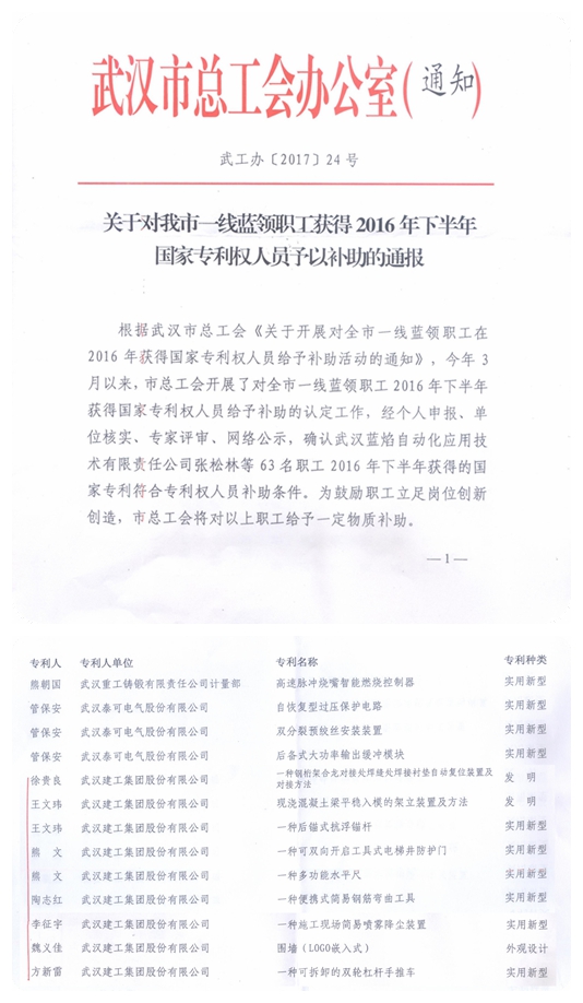 為鼓勵職工立足崗位創(chuàng)新創(chuàng)造,近日武漢市總工會對2016年下半年獲得國家專利權(quán)的一線職工發(fā)放了專利補助。經(jīng)過個人申報、單位核實、專家評審、網(wǎng)絡(luò)公示,全市共確認了63名具備補助條件的職工,其中武建集團的徐貴良、熊文、王文瑋等7位員工取得的《一種鋼桁架合攏對接處焊縫襯墊自動復(fù)位裝置及對接方法》等9項專利成果入選。